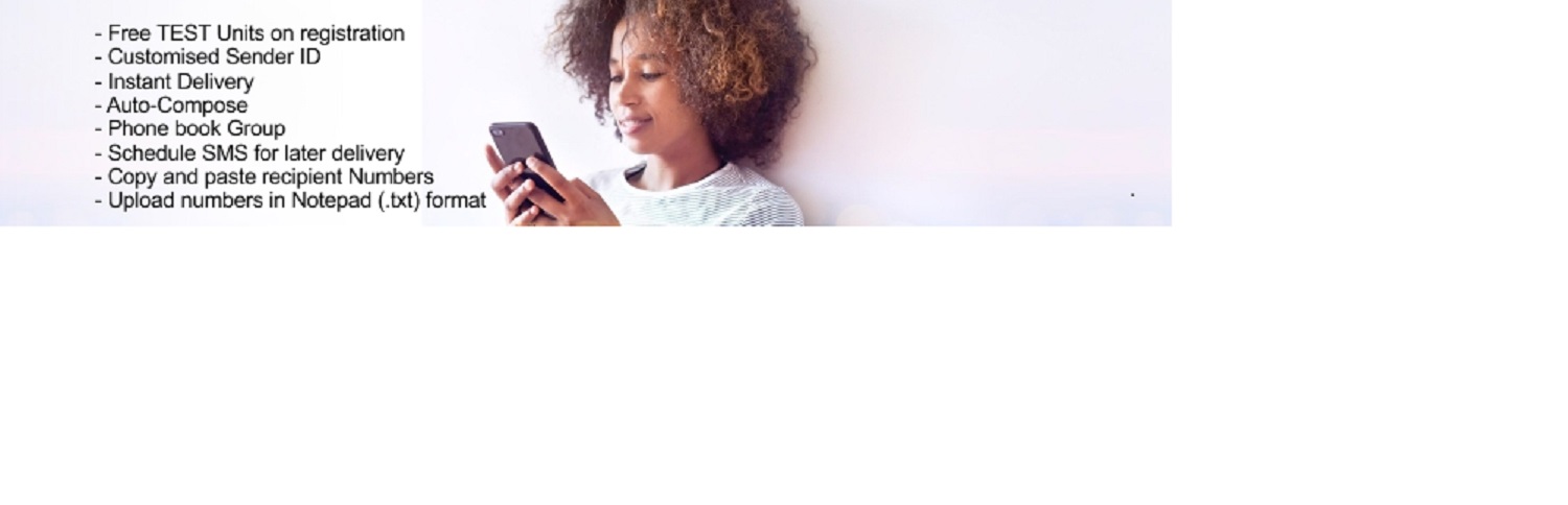 SIGNUP NOWWe offer features such as: Free TEST Units on registration, Customised Sender ID, Instant Delivery, Auto-Compose SMS, Phonebook Grouping, Schedule SMS for later delivery, Copy and paste recipient Numbers, Upload numbers in Notepad (.txt) format